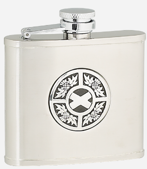Flachmann aus Edelstahl mit unverlierbarem Deckel und Trichter zum Einfüllen. In satiniertem Finish. Es stehen verschiedene Embleme zur Wahl.